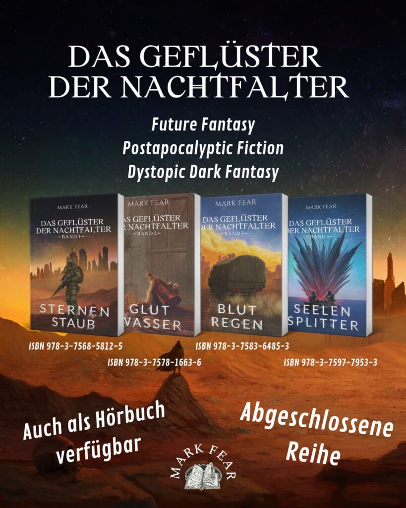 Mit der Future-Fantasy-Reihe »Das Geflüster der Nachtfalter« habe ich ein spektakuläres Genre-Mashup geschaffen: Postapokalyptische Fiction trifft auf dystopische Dark Fantasy, schießwütige Elitesoldaten auf mutierende Untote und magiebegabte Überlebende auf fanatische Sektenmitglieder.
